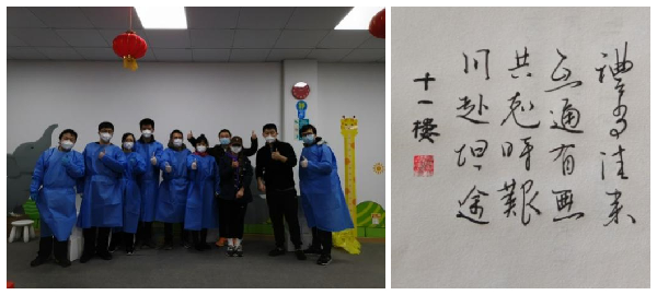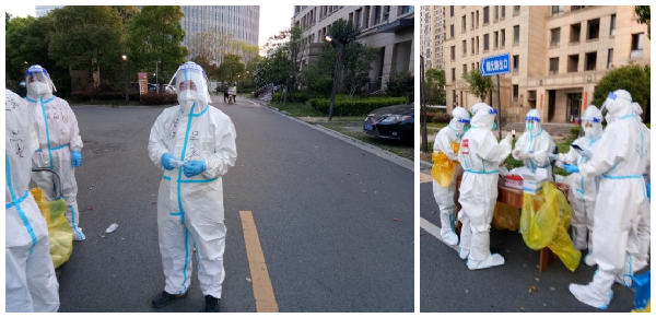 安抚好群众情绪,完成自我防疫保护后,已经中午。按照责任划分,吴飞科老师负责安保,其他人员叫层号、测温、登记、扫码等,消毒,桌椅摆排,防疫袋固定,再次消毒。所有工作紧张有序,等待核采人员的到来。直到下午六点,江苏第二中医院医务人员到达指定地点,志愿者和物业顺利检测。之后,叫楼层号,一低两高,有序经楼道和电梯进行核酸检测,核采过程中,吴飞科老师引导队伍并控制长短,适当转折,有意规避生活垃圾分类处。5、4、6、7,完成这几个楼栋的检测,同其他医务人员会师,共同对2和11进行核采。2和11,正是4月4日感染楼栋。