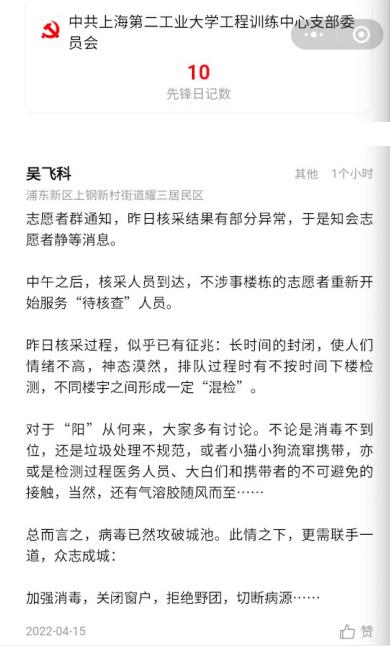 4月8日晚上21:40,所负责的模块教学基本结束、线上教学暂告一段落的吴飞科老师,看到楼宇交流群中紧急发布的抗原发放通知,接龙加入到了抗疫志愿者队伍中,对负责楼栋逐户敲门发放。效率较低,直至23:20方完成发放。实际情况是,8日公寓出现感染记录!并于次日防疫网站予以公布。自4月4日近一周封控努力归零,解封日期再次调整为14天。